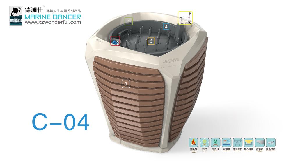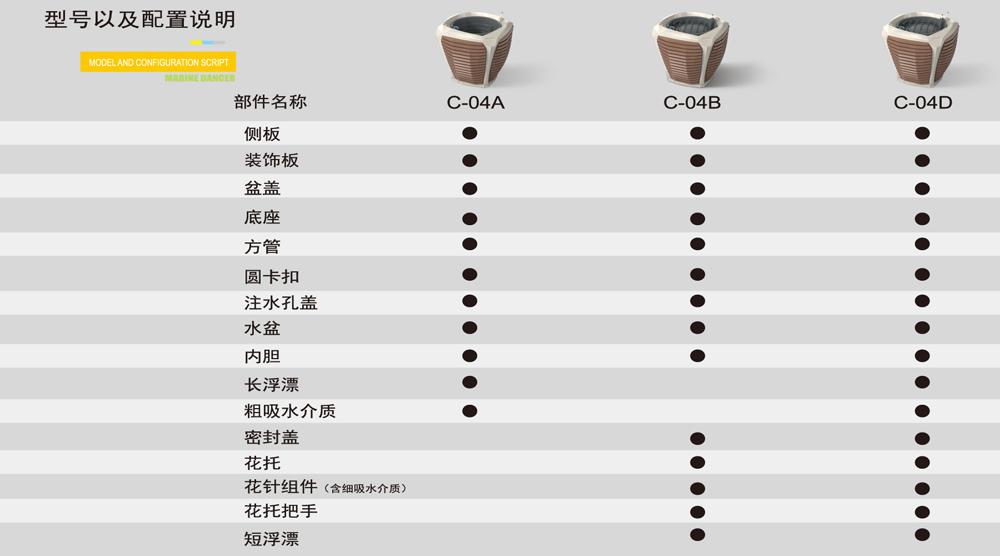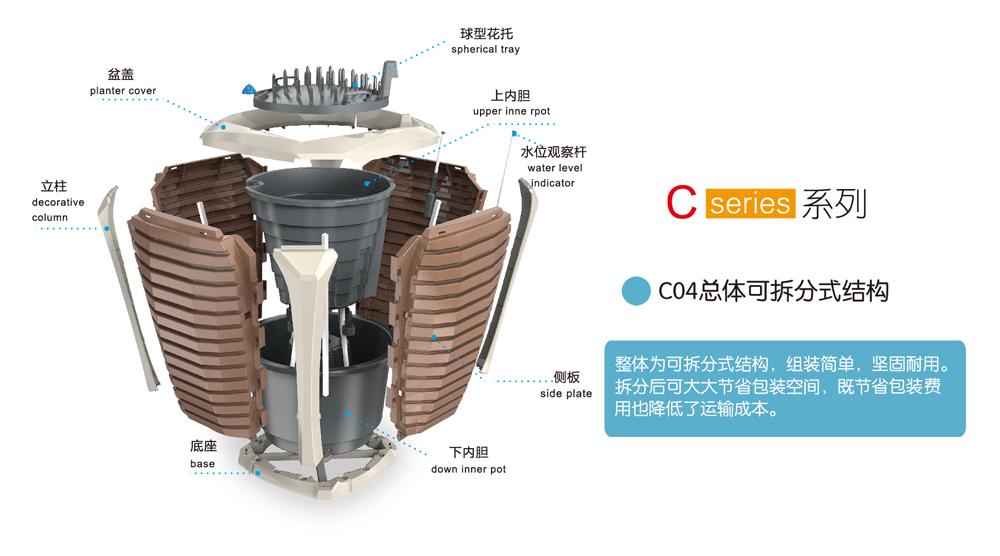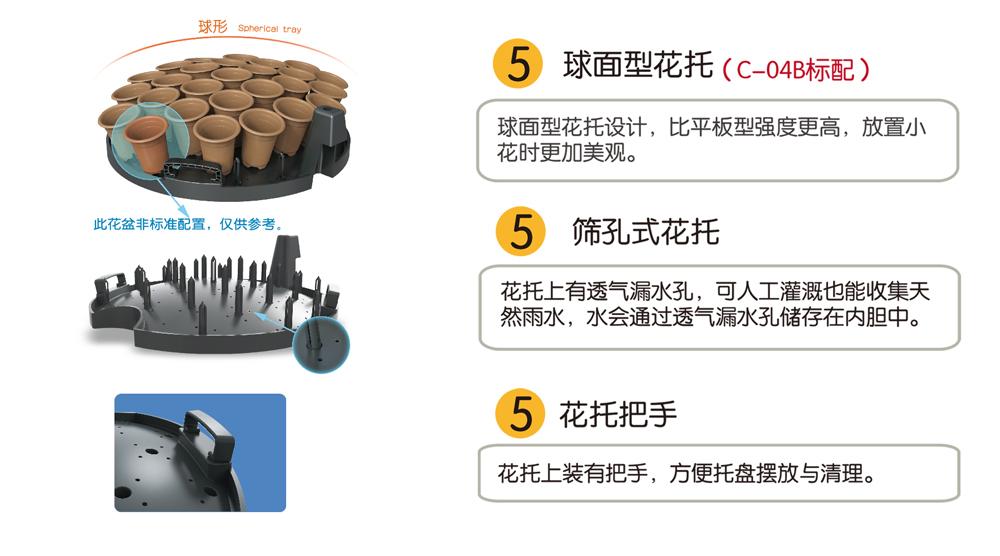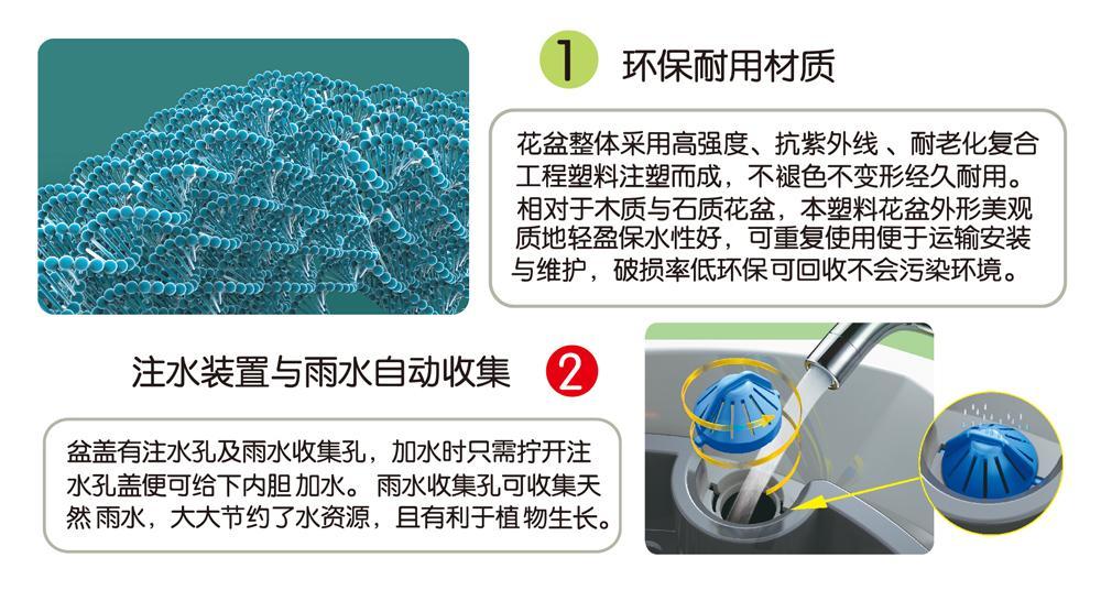2.整体材质:花盆(其中盆盖,外盆体厚度≥4mm,内胆,水盆,花托厚度≥5mm)整体采用高强度、抗紫外线 、耐老化复合工程塑料注塑而成,不褪色不变形经久耐用。相对于木质与石质花盆本塑料花盆外形美观质地轻盈保水性好,可重复使用便于运输安装与维护,破损率低环保可回收不会污染环境。