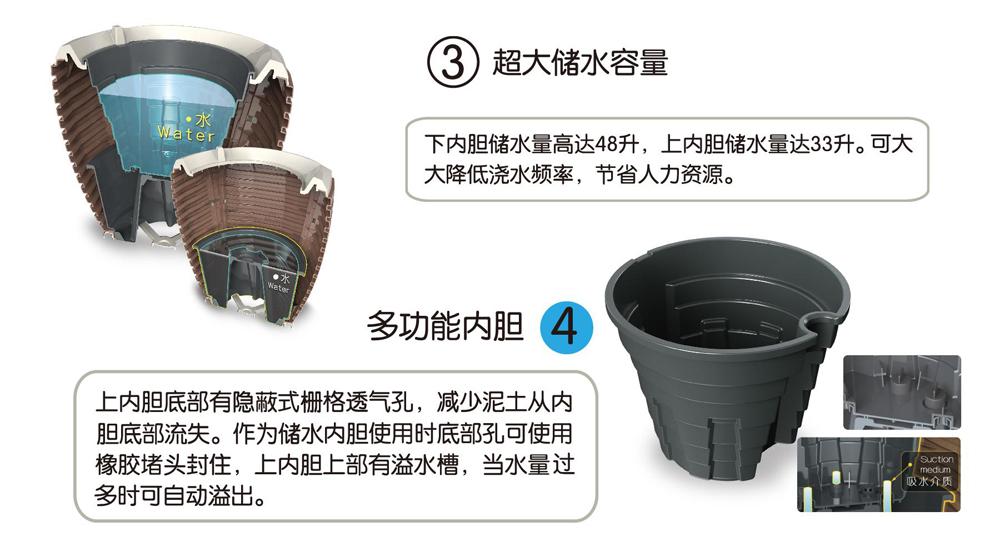 6.超大储水容量:下内胆储水量高达48升,上内胆储水量达33升(栽种大型花草时内胆储土容量达50L)。可大大降低浇水频率,节省人力资源。