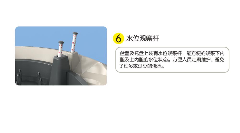 5.水量观察杆:上盖及托盘上装有水量观察杆,可以很容易的知道植物是否缺水。方便人员定期维护,避免了过勤或过少的浇水。