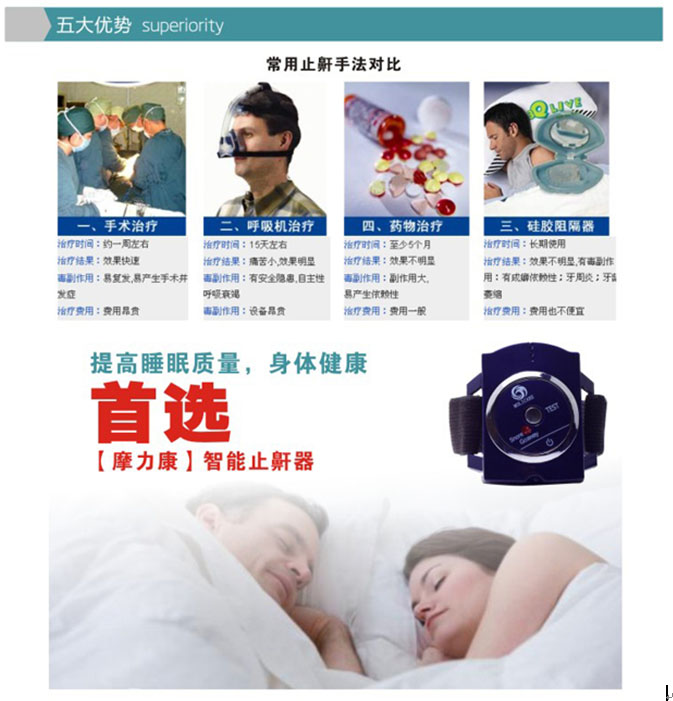 摩力康电子生物止鼾器,2011年获得国内止鼾器外观设计专利,采用中电子针灸,依据学生物反馈疗法,智能侦测使用者鼾声,电子针灸刺激腕部神经穴位,根据神经反馈调节喉头悬壅垂肌肉,打开阻塞的气道,从而实现快速止鼾,无需手术、不打造、不吃,安全无副作用。完全不影响正常睡眠质量的弱电脉冲。自动过滤背景环境杂音,有效侦测辨识使用者的鼾声自动感应,连续三个鼾声后(超过65分贝),自动发出电波,制止打鼾,手表式外观功能设计,无副作用8小时自动完成操作控制,有效改善睡眠状况,创造安静舒适睡眠环境。