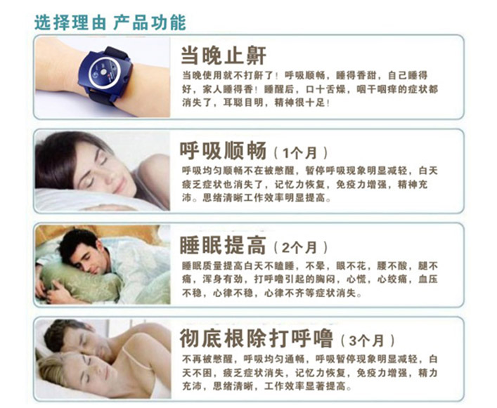 3、不插电,无安全隐患。摩力康生产的止鼾仪是全新的绿色物理疗法电子止鼾器产品,不需要插电或再另外增加任何复杂的东西,只需要每天睡觉的时候带在手腕上即可治疗打鼾,效果明显。