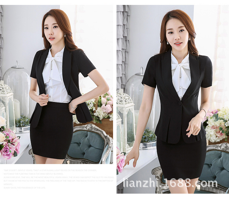 韩版职业女裙套装套裙时尚女短袖正装西装套裙 这是一款韩版设计的职业装,款式时尚修身,是职场必备的一款职业套裙