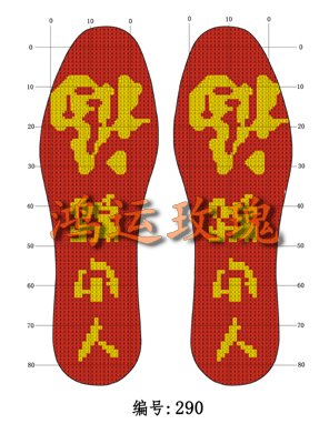 我厂经过3年的研究,现自主研制出一种新型十字绣鞋垫,它是将民族传统的手工艺结合现代先进技术,按十字绣规律巧妙,均匀在多层棉布上用专用机器冲出万余小孔,孔从鞋垫的正面通到鞋垫的背面,对鞋垫体毫无损伤。小孔直径1.0毫米,两孔中心距2.5毫米。横竖排列有序,每4个针孔,就形成一个小方格,这样每双鞋垫上就有万余个小方格。无论有无刺绣经验,只需对孔穿针引线就能绣出精美的图案。