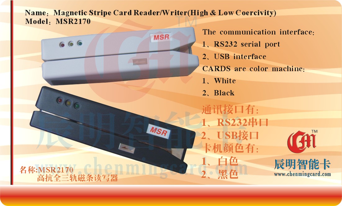 ● 本公司产品MSR-2170磁条读写器可联接任何电脑或终端,用于读写300 oe~4000 oe磁卡或存折本上的磁条信息。读写均一次刷卡完成,读写成功率高,产品可广泛应用于银行储蓄、对公查询、证券交易、考勤、食堂用餐、商业POS、医疗收费、税务管理、交通管理等领域。