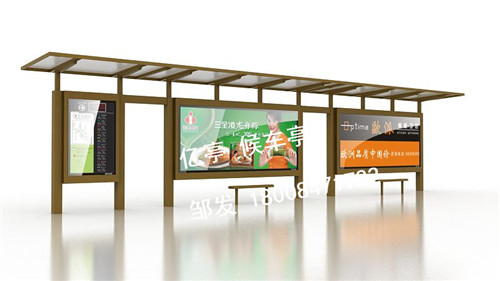 候车亭使用材料:立柱多采用304不锈钢板材压制或直径为114mm、141mm、133mm的不锈钢管、镀锌钢管,还有的是矩形管立柱,常见的有100mm*100mm、120mm*120mm、100mm*150mm。采用不锈钢材料制作的候车亭较易清理,而采用镀锌钢管制作的候车亭色彩则较为美观、多样。顶棚一般采用304不锈钢板或镀锌板制作(厚度1.2mm或者1.5mm),也有用铝塑板、阳光板、耐力板的(厚度为4.2-4.5mm)。