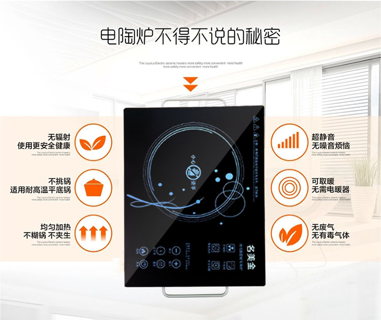 3、无辐射:采用红外线发热原理,没有电磁炉的高频电磁波的辐射,无明火,不产生一氧化碳,属于无污染和无害人体物质的健康产品。