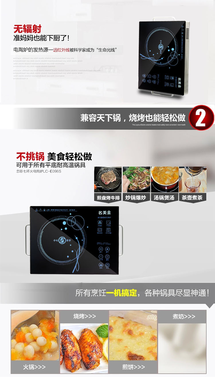 9、一炉多能:除了具有煎炒、烧烤、火锅、爆炒、热奶、煲汤、慢炖、预约等强大功能外,还能配套烤盘,烤网进行铁板烧,烧烤休闲娱乐,另外还有一项独特优势,就是寒冬岁末,电陶炉还可以当暖炉使用。