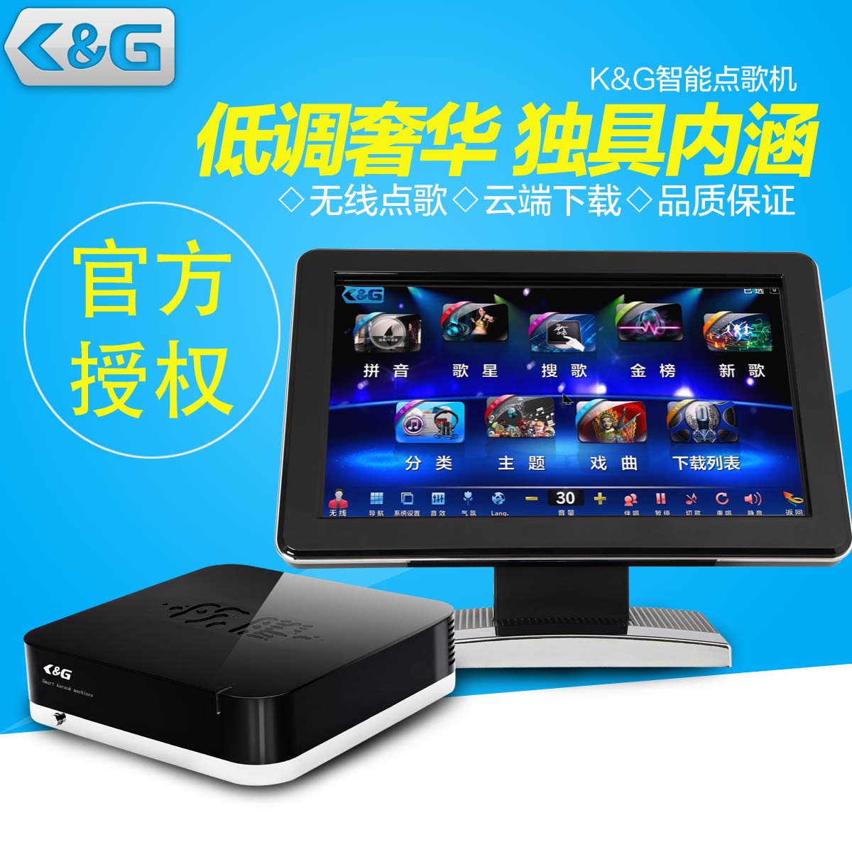 家用高清点歌机_点歌机价格_点歌机批发首选K&G智能点歌机K&G点歌机中的高端品牌,获得酷歌这一全球最大正版卡拉ok音乐发布平台的正式授权,取得两万首正版歌曲的使用授权以及无限量的新歌云端更新。K&G是全球首家全部搭载正版歌曲的高端点歌系统品牌。