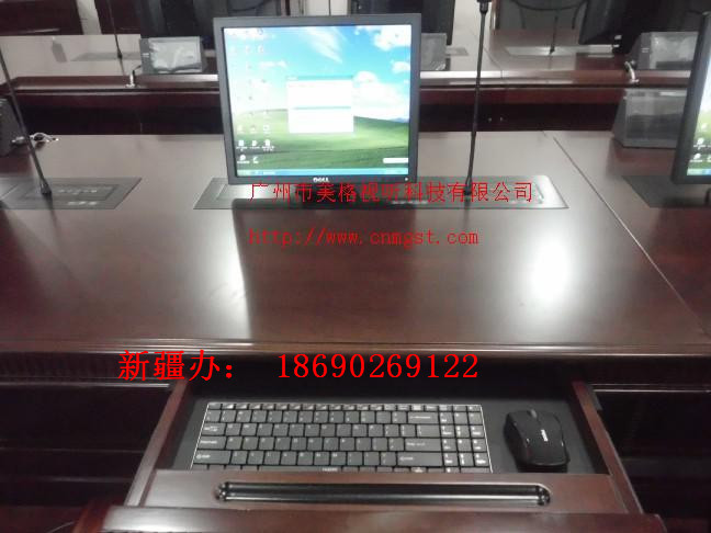面板上有手动按压式控制开关按钮,有上升、停止、下降、前仰、后仰、电脑六个按钮。使用时可按上升键升至桌面,显示屏自动开机。不用时降至桌内,与桌面不错平整,不留空隙。按电脑键可使对应电脑主机直接开机,简单方便。