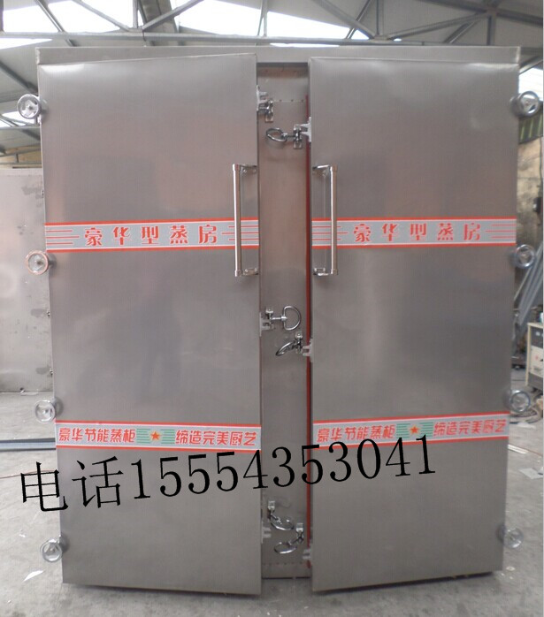 本厂研发的大型馒头蒸房,是由柜体、柜门、蒸饭室和蒸饭格组成,蒸饭格下方固定有滑车,蒸饭格与滑车间只有一个面通过连接板固定在一起,使滑车与最下层蒸饭格间形成三面开放的凹槽,蒸饭室的下底面可以伸入凹槽内,连接板的内表面设有密封条,蒸饭格上活动插接有把手,本实用新型具有在蒸饭格上设有滑车、不需搬抬蒸饭格、劳动强度低、安全可靠、结构简单、使用方便的特点。