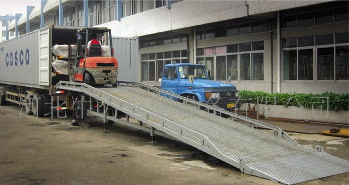 移动式登车桥广泛用于物流场所,是与车配合使用的货物装卸辅助设备,借助该设备,叉车能直接驶入汽车集装厢内部进行批量装卸作业,只需单人操作,不需动力电源,既可实现货移动式登车桥台面铺防滑钢板拉网,下衬δ4钢板,既增加防滑功能,又增加了桥面强度,即使雨雪天气,也不影响装卸货物。