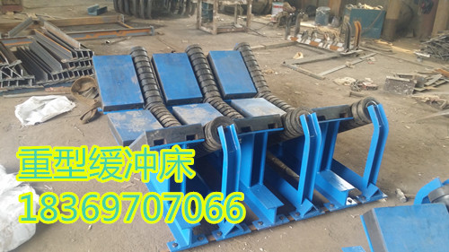 输送带落料区域,落料高度超过3m,最大颗粒度300目以上就需要选用超重型缓冲床;铁矿、石矿等输送重型物料矿场的输送带,落料高度超过2m,最大颗粒度超过300m也需要选用超重型缓冲床。超重型缓冲床依靠60mm厚工字钢钢板结构可以有效吸收物料的落料冲力,大大减少对输送带的损伤机率。