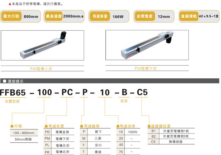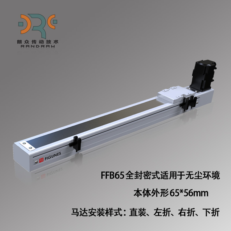 皮带仕样单轴机械手FFB65:同步带传动是由电机驱动同步带的主动轮转动,进而有皮带带动直线导轨上的滑块前后移动。同步齿形带具有噪音低,移动速度快,成本较低等特点。速度方面,一般可以实现比滚珠丝杠更高的速度。同时没有临界速度的限制,在长行程传送方面具有更加的性价比,但同步带传动的定位精度较之滚珠丝杠要低。在自动化领域应用广泛,配合伺服电机或者步进电机,可以实现不同应用场合下的精确定位。作为现代工业模块化和集成化理念的不断应用。