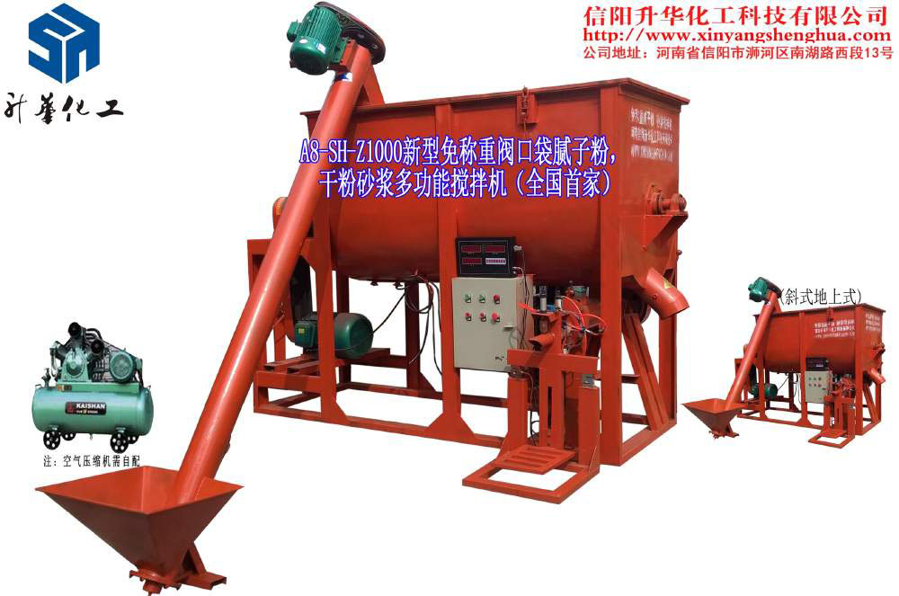 A8新型全自动免称重粘结砂浆搅拌机属于卧式机,U形搅拌筒,内外二层螺带混合,两侧翻滚混合,筒壁无积块,无死角,混合速度快,均匀度高;配有螺旋上料提升机,投料口与地面齐平,进料方便。整机运转平稳、噪音低,使用寿命厂,安装方便,广泛用于生产干粉腻子粉、粉刷石膏、硅藻泥、瓷砖粘结剂、保温砂浆、粘结砂浆、抹面砂浆等各种粉体材料的搅拌。干粉混合机为了便于用户成品包装,在手动出料的基础上增加了电动放料装置及电脑计量装置,出料速度快;计量精准度高, 1-2人即可操作,免除您称重封包装的烦恼,省却工时,容量有1000型,2000型,3000型等不同机型,产量有日产16-60吨不同机型,年产量在5000吨到3万吨不同,在有限工作时间实现产量大幅提升,经济实用,产品畅销全国20多个省市。另外有不锈钢材质的,可用于各种干粉食品原料的生产。