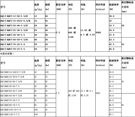流量是BQS(W)防爆潜水泵在单位时间内输入送出去的液体量;扬程是所抽送的单位重量液体从泵进口处至泵出口处能量的增值。(简单而言:在无能量损耗前提下,泵所抽送的单位重量液体通过泵后从泵所在液体的液面能送到的最高垂直高度,即泵抽送液体的液柱高度,习惯简称为米。