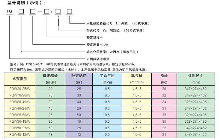 型号示例:FQW20-40/W FQW为代表输送介质为污水的矿用风动潜水泵;额定流量是20立方米每小时,额定扬程40米,泵型式为涡轮为闭式(水轮)。本产品属于风动工具,定名为矿用风动潜水泵.