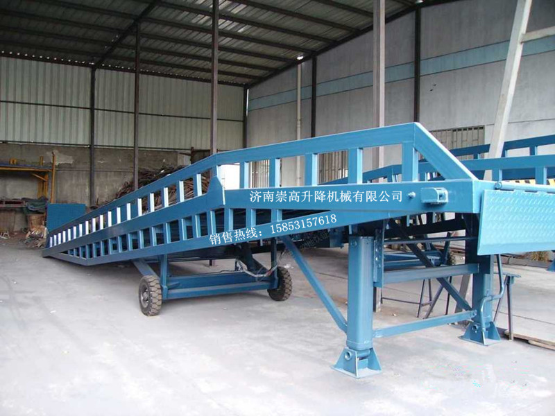 移动式液压登车桥,可载重:6、8、10、12、20吨,广泛用于无装卸设备的货台及流动装卸场所,是与叉车配合使用的货物辅助设。备借助该设备,叉车能直接驶入汽车车厢内部进行批量装卸作业。只需单人操作,不需动力电源,即可实现货物的安全快速装卸。既可使您减轻劳动强度,又能成倍提高装卸作业效率,加快物料流通速度,获取更大经济效益。适用场所:装卸车频繁、车型不一的大型企业、仓库、工厂、车站、码头、仓储物流基地等。