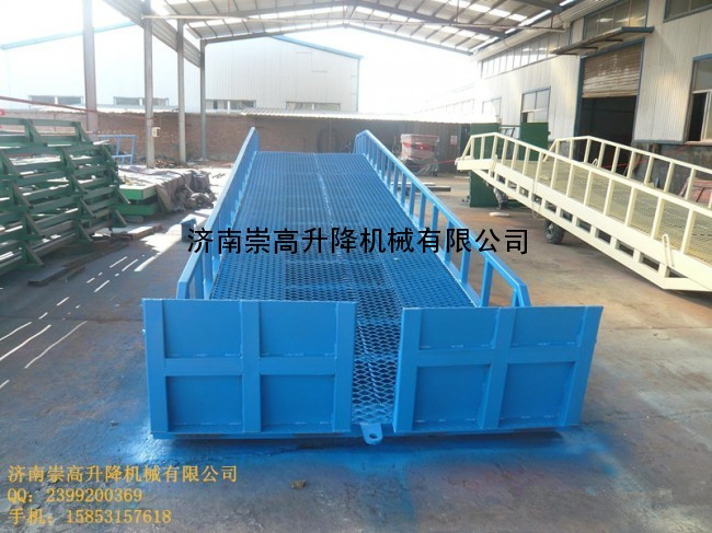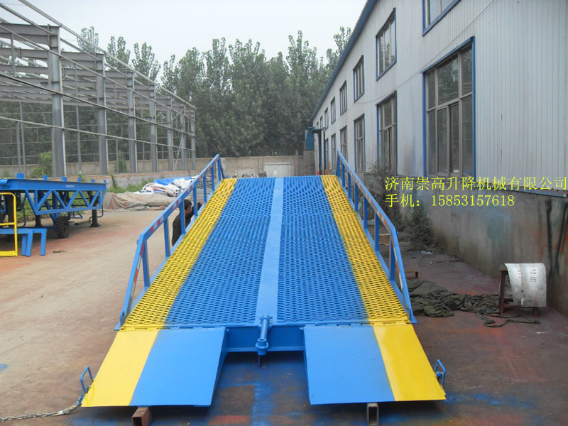 移动式液压登车桥,可载重:6、8、10、12、20吨,广泛用于无装卸设备的货台及流动装卸场所,是与叉车配合使用的货物辅助设。备借助该设备,叉车能直接驶入汽车车厢内部进行批量装卸作业。只需单人操作,不需动力电源,即可实现货物的安全快速装卸。既可使您减轻劳动强度,又能成倍提高装卸作业效率,加快物料流通速度,获取更大经济效益。适用场所:装卸车频繁、车型不一的大型企业、仓库、工厂、车站、码头、仓储物流基地等。