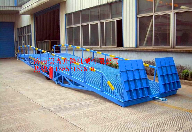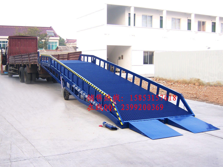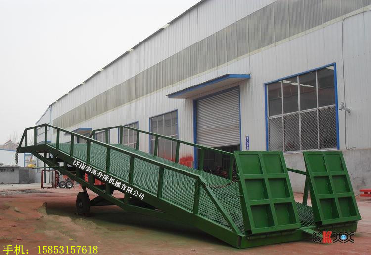 移动式液压登车桥,可载重:6、8、10、12、20吨,广泛用于无装卸设备的货台及流动装卸场所,是与叉车配合使用的货物辅助设。备借助该设备,叉车能直接驶入汽车车厢内部进行批量装卸作业。只需单人操作,不需动力电源,即可实现货物的安全快速装卸。既可使您减轻劳动强度,又能成倍提高装卸作业效率,加快物料流通速度,获取更大经济效益。适用场所:装卸车频繁、车型不一的大型企业、仓库、工厂、车站、码头、仓储物流基地等。