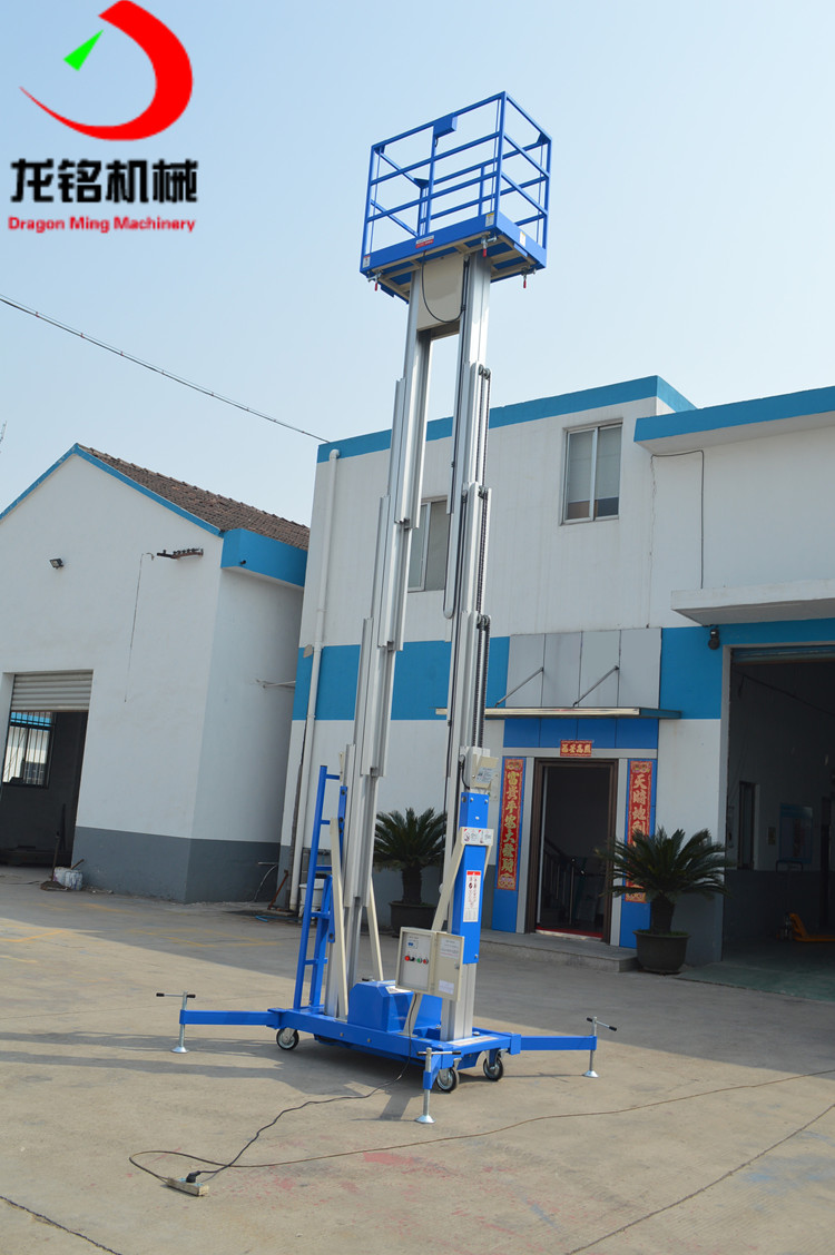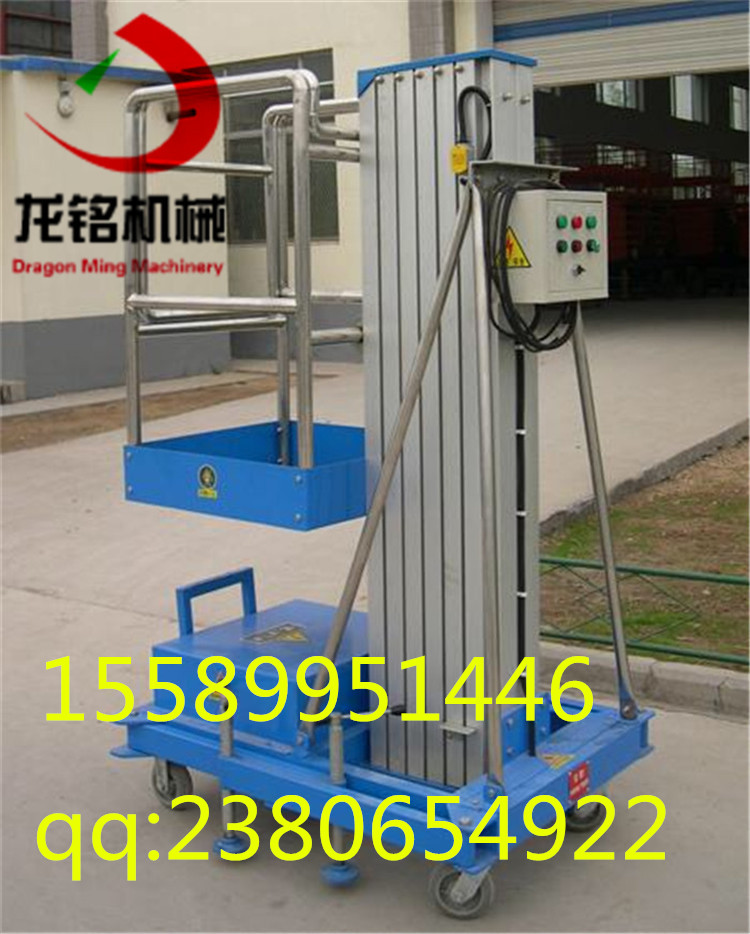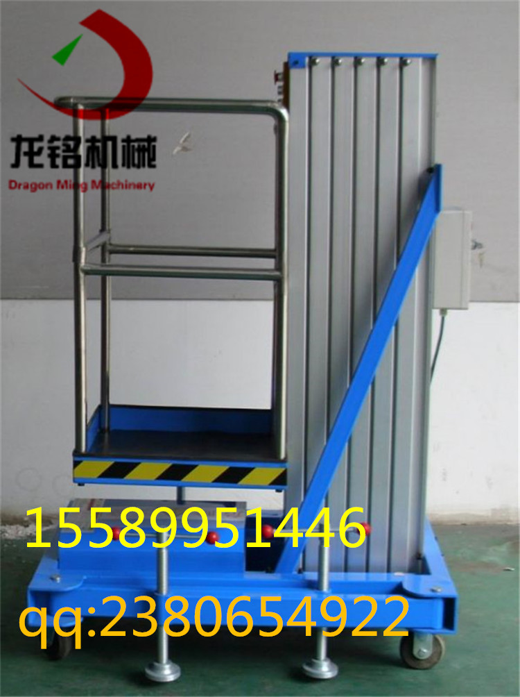 铝合金式升降机采用高强度优质铝合金材料,具有造型美观、体积小、重量轻、运转灵活,推行方便升降平稳、安全可靠等优点。它轻盈的外观,能在极小的空间内发挥最高的举升能力。广泛用于工厂、宾馆、餐厅、车站、影剧院、展览馆等场所,是保养机具、油漆装修、调换灯具、电器、清洁保养等用途电话:15589951446