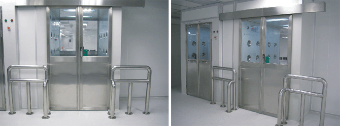 货淋室是货物进入洁净室所必需的通道,它可以减少货物进出洁净室所带来的污染问题。货淋室的两道门电子互锁,可以兼起气闸室的作用,防止未被净化的空气进入洁净室,本公司生产的高科技智能语音货淋室带有语音提示系统,在吹淋时由自动语音系统提示,人性化语音提示给人一种亲切感觉,并达到有效的净化效果,经高效过滤器过滤后的洁净气流由可旋转喷嘴从各个方向喷射至人身上,有效而迅速清除尘埃粒子,带有尘埃粒子的空气再由初、高效过滤器过滤后重新循环到网淋区域。