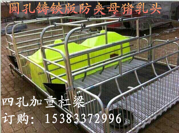 母猪产床专为母猪产仔设计的,母猪产仔和初生仔猪的养育是养猪生产中非常重要的环节,初生仔猪个体小、体弱,调节体温的机能不健全,对寒冷的抵抗力差,在冬天产仔常出现冻死、压死、踩伤的危险。仔猪成活率的高低,很大程度上取决于猪舍结构、供暖通风和分娩栏的结构。
