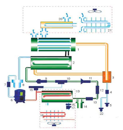 1、空气热交换器 2、蒸发器 3、气液分离器 4、排水防堵过滤器 5、手动排污阀 6、制冷压缩机 7、吸气过滤器 8、汽化器 9、分液器 10、气液混合器 11、热力膨胀阀 12、视镜 13、干燥过滤器 14、储液器 15、热气旁通阀 16、水量调节阀 17、水质过滤器 18、冷凝器(风冷) 19、冷凝器(水冷) 20、前置预冷器(水冷) 21、前置预冷器(风冷) 22、自动排水器