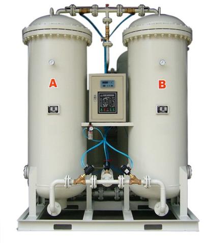 压缩空气经空气净化系统除去油、水、尘埃等杂质后进入装有沸石分子筛的吸附塔,空气中的氮气、二氧化碳、水蒸汽等被分子筛大量吸附,而氧气由于扩散速率大而穿过吸附剂,而实现 氮、氧分离。
