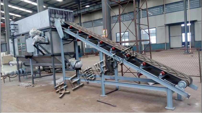 工作原理:袋装粉粒体物料由皮带输送机传送至45度角的滑板并依靠重力沿滑板下滑,在下滑过程中由快带转动的刀片将包装袋割开,被割开的残袋和物料骨入滚筒筛进行筛分。从滚筒筛落下的物料由螺旋输送机输出,破损的包装袋、杂质、结块物料被滚筒筛带出机体,割刀破袋过程中引起的粉尘由布袋式除尘器捕捉并抖落入螺旋输送机(由螺旋输送机输出的物料可采用我公司设计制造的密相气力输送装置和稀相气力输送装置,输送至物料储蓄罐中)。