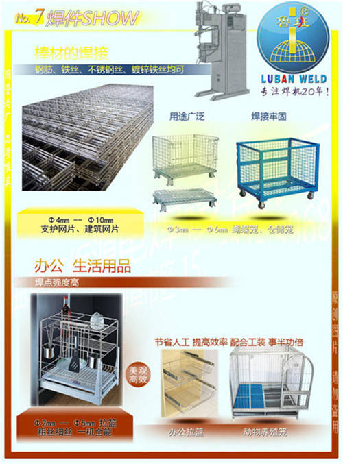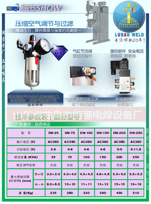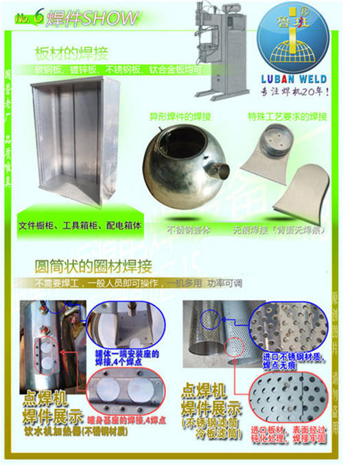 鲁班牌DN系列气动点焊机广泛用于金属箱柜制造、建筑机械修造、汽车零部件、自行车零部件、异形标准件、工艺品、电子元器件、仪器仪表、电气开关、电缆制造、过滤器、消声器、金属包装、化工容器、丝网、网筐等金属\中低碳钢板、不同厚度的金属板材、园钢与园钢、小直径线材、钢板与工件及各种有色金属异形件进行高质量、高效率的焊接。