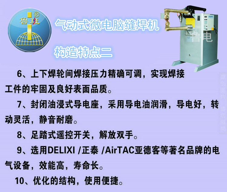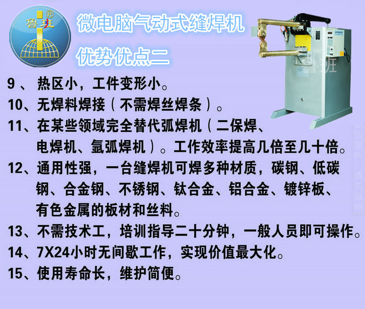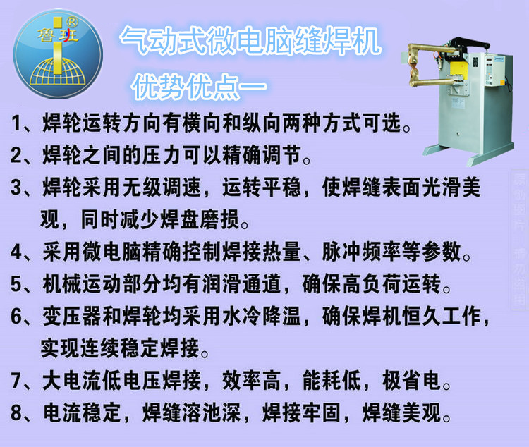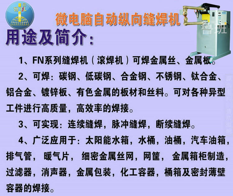 直缝滚焊机是指焊件装配成搭接或对接接头并置于两滚轮电极之间,滚轮电极加压焊件并转动,连续或断续脉冲送电,形成一条连续焊缝的电阻焊机器。也可以说,缝焊机是点焊的一种演变。缝焊广泛地应用在要求密封性的接头制造上,有时也用来焊接普通非密封性的板金件,被焊金属材料的厚度通常在0.1~2.5mm。