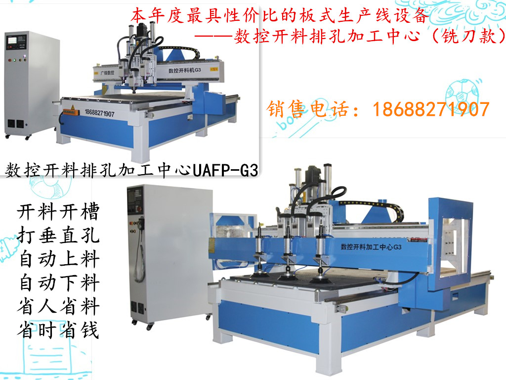 设备功能:自动上料、开料开槽、开异形料、打垂直孔、自动下料;门板铣型