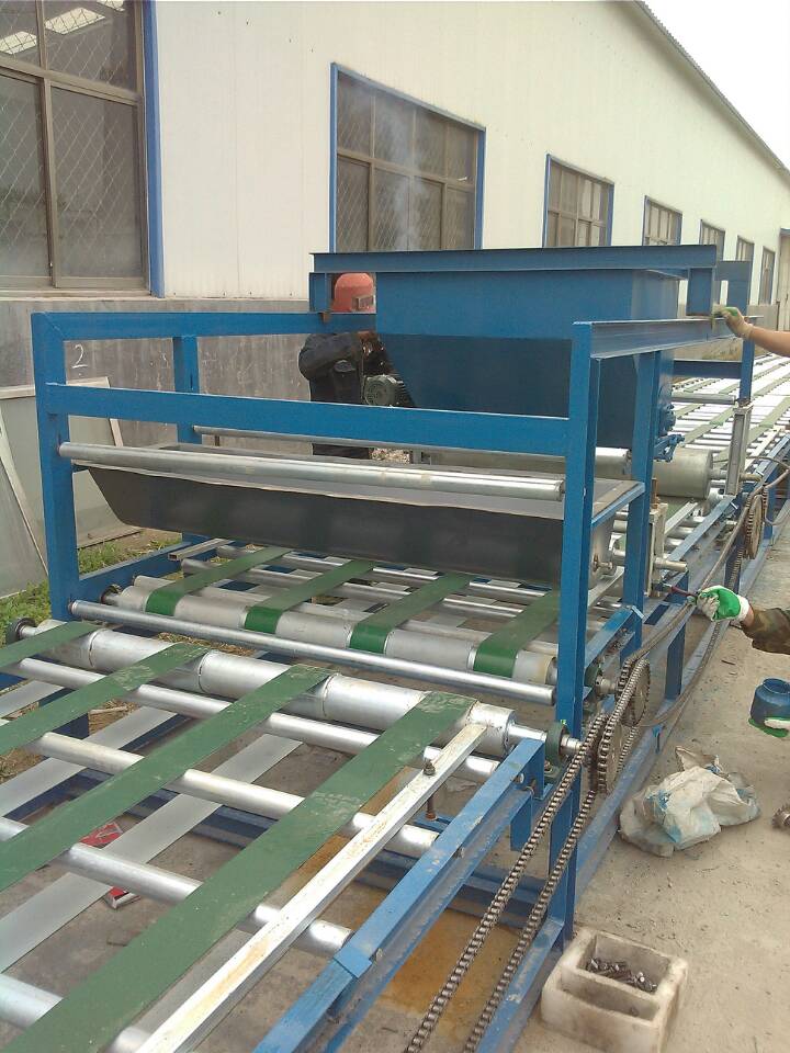 外墙保温板设备又名水泥粉煤灰复合荚芯墙板设备”是以聚苯乙烯加粉煤灰、矿渣和外加剂等,复合而成的轻质墙体板材。“水泥粉煤灰复合荚芯墙板”主要生产工序包括,砂浆搅拌、砂浆铺覆、复合玻璃纤维布、辊压、铺聚苯板、砂浆铺覆、复合玻璃纤维布、辊压成型、养护、脱模、切割、堆放等步骤。产品采用机械化流水线生产。外墙保温板设备产品尺寸为:长2500-3500mm,宽600mm,厚60-240mm。产品侧向可带有连接槽,施工安装方便。该产品力学性能好,并且具有质量轻、强度高、吸水收缩率低、保温、隔音等优良性能,满足相关技术标准要求。由于该产品具有吸水收缩率低的特点,使得所安装墙体不易开裂。该产品施工安装方便,比红砖及小型砌块可提高施工效率五倍以上。可广泛用于框架结构建筑内隔墙、钢结构内外墙、灵活隔断墙、冷库、活动房屋、商亭等场合。