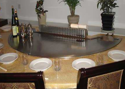 乌兰浩特自助铁板烧,无烟铁板烧;凯丰恒业所生产的各种铁板烧设备,其表面钢板均采用20MM厚特殊金属材料,经多道机加工铣刨磨后制造而成,其表面光泽度均达到6-7级。由于采用多元素材质钢板,因此有热变形极低,表面硬度高的特点,在刀叉铲与钢板表面长期摩擦的情况下,不会产生划痕,并避免了像其它普通钢板因长时间受高温加热而变形或出现裂纹、小黑点等现象。