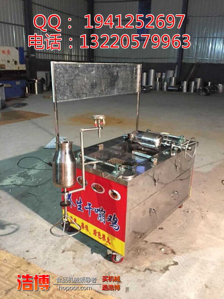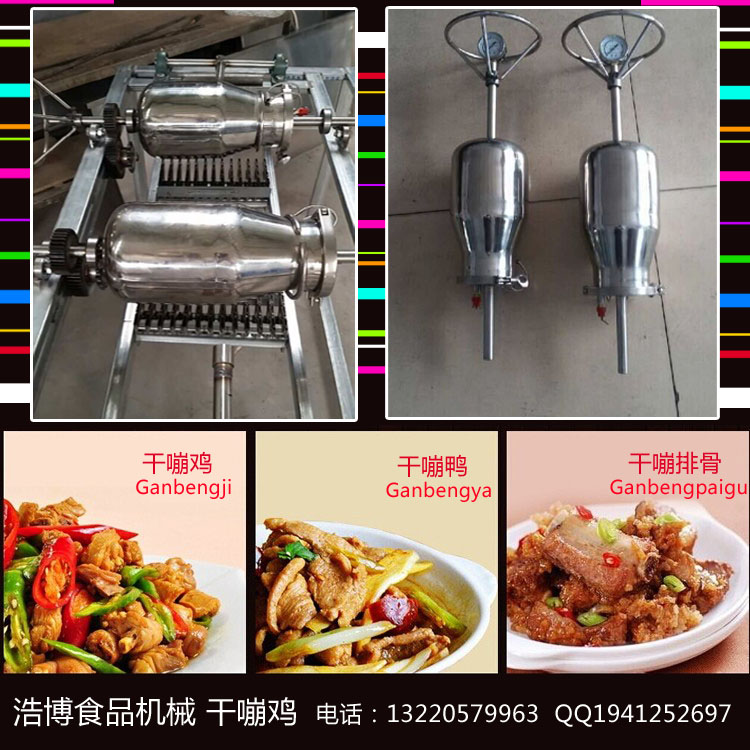 浩博机械2013年研制实验用旧式大炮爆米花机蹦鸡肉,爆板栗,排骨,羊排,牛排等,的确具有“色、香、味”三味齐全,肉质骨酥,软而不烂,滋味醇香,扬名遐迩,妇孺皆知,很快干锅嘣鸡传名四海,备受大家青睐。新式嘣米鸡机器,干嘣米鸡机也叫大炮机,其选用不锈钢制作,由浩博食品机械技能人员研制改善成功通用的多功用蹦米鸡,该嘣米鸡机是依据市场需要规划,机型时髦奢华,集各种型炒货机的性能长处为一体,机械性能安稳,选用封闭皮带传动,选用液化气加热机型,节能,高效,安全,卫生。