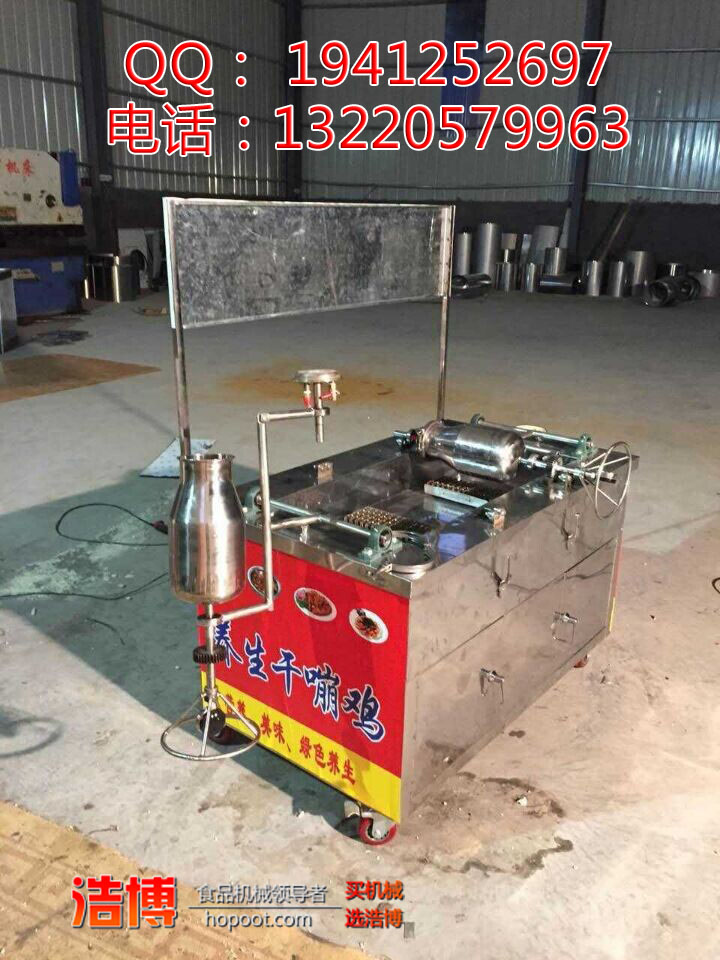 干锅嘣香鸡来源: 浩博食品机械机械2013年研制实验用旧式大炮爆米花机蹦鸡肉爆板栗 排骨 羊排 牛排等,的确具有“色、香、味”三味齐全,肉质骨酥,软而不烂,滋味醇香,扬名遐迩,妇孺皆知,很快干锅嘣鸡传名四海,备受大家青睐。新式嘣米鸡机器, 嘣米鸡机也叫大炮机,其选用不锈钢制作,由诚远食物机械技能人员研制改善成功通用的多功用蹦米鸡,该嘣米鸡机是依据市场需要规划,机型时髦奢华,集各种型炒货机的性能长处为一体,机械性能安稳,选用封闭皮带传动,选用液化气加热机型,节能,高效,安全,卫生。