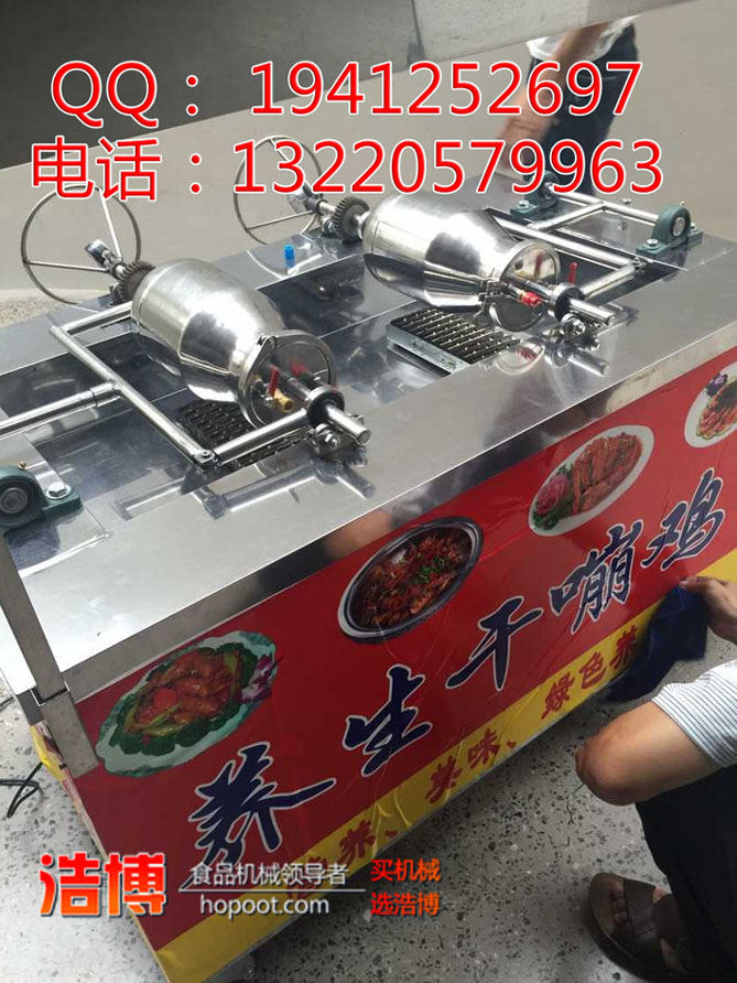 浩博食品机械嘣鸡炉采用电瓶电动旋转360度拌和翻滚,主动拌和翻炒,加热与拌和均匀,相对密封,焖炒作用格外好,特作出入锅十分快捷,漏斗进货,省时省力,嘣米鸡机具有主动出锅功用,操作简单,快捷,易懂等许多长处,使用该嘣米鸡机合作咱们赠送的特制配方和技能炒制的食物色泽与口味更佳,远距离香气年鼻,是目前嘣米鸡机市场上最领