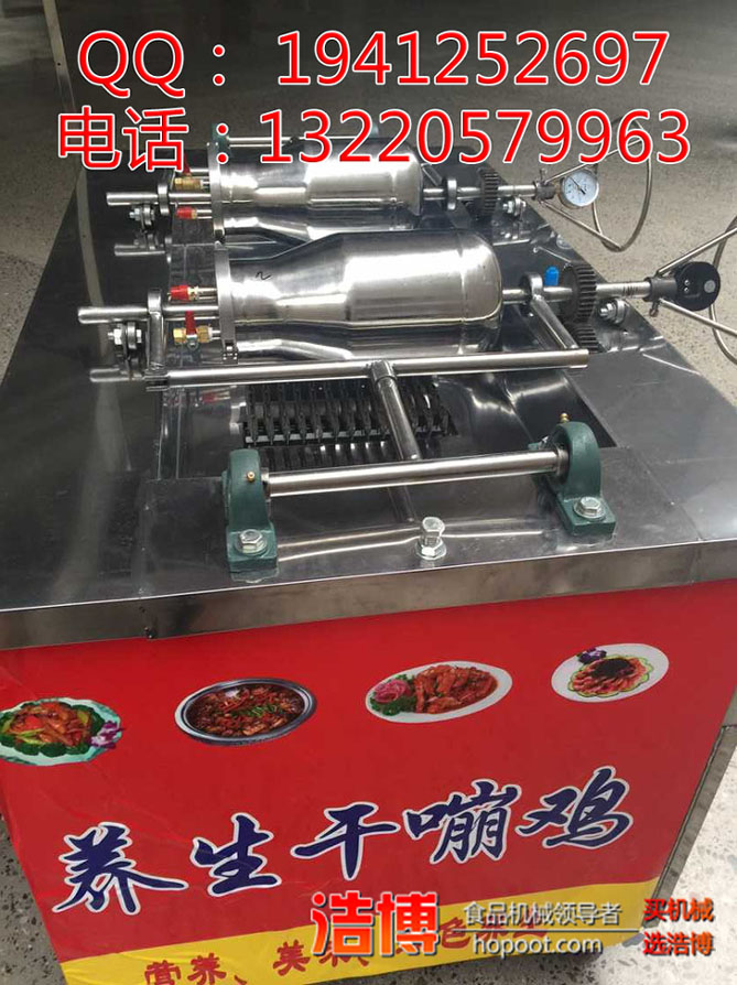 浩博机械2013年研制实验用旧式大炮爆米花机蹦鸡肉,爆板栗,排骨,羊排,牛排等,的确具有“色、香、味”三味齐全,肉质骨酥,软而不烂,滋味醇香,扬名遐迩,妇孺皆知,很快干锅嘣鸡传名四海,备受大家青睐。新式嘣米鸡机器,干嘣米鸡机也叫大炮机,其选用不锈钢制作,由浩博食品机械技能人员研制改善成功通用的多功用蹦米鸡,该嘣米鸡机是依据市场需要规划,机型时髦奢华,集各种型炒货机的性能长处为一体,机械性能安稳,选用封闭皮带传动,选用液化气加热机型,节能,高效,安全,卫生。
