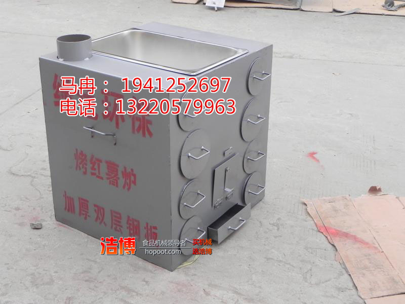 传统卖烤红薯(地瓜)炉都用旧油桶做的,看起来黑乎乎的,给人们一种很不卫生的感觉,速度慢,操作困难,烤的质量差,有煤烟灰尘污染, 本厂生产的地瓜炉(烤红薯机、烤芋头机)以密封钢管为加热导体,让火源与食品百分百完全隔离、在一定温度下全方位持续均匀烘烤,速度快、质量好,可移动、色香味俱佳,安全环保营养,完全抛弃街头大铁桶烧烤山芋的遗缺:煤烟气、黑焦点、SO2、笨及衍生物和其它化学污染源等有害物质,全力维护休闲食品的质量安全,努力推广中国十大经典小吃文化-(烤山芋/地瓜/红薯/黄梨/香蕉)。其为方形9孔,无需电源(煤.炭.草.木等多种燃料),环保安全营养,日产60-500斤 ,利润>200% 特点:投资少、见效快(10-30天收回经济成本);易起步(40-50人员、下岗待业职工、简单易学);风险低(以销定产,现做现卖);工艺设计创新(采购—清洗—烘烤—翻调—销售);原料易购(当地农村或城市批发市场);操作性强(个人致富创业、经营收入稳定);营销方向(商业街、学校、商超、车站、广场等)。