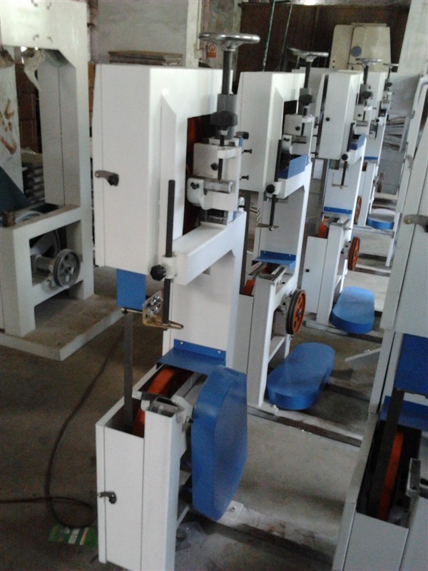 木工带锯机锯轮分有幅条式的锯轮和幅板式的锯轮;立式锯一般下锯轮为主动轮,木工带锯机上锯轮升降装置用于装卸和调整带锯条的松紧;上锯轮仰俯装置用于防止带锯条在锯切时从锯轮上脱落。带锯条张紧装置则能赋予上锯轮以弹性,保证带锯条在运行中张紧度的稳定;旧式的采用弹簧或杠杆重锤机构,新式的则采用气压、液压张紧装置。导向装置俗称锯卡,木工带锯机用以防止锯切时带锯条的扭曲或摆动;下锯卡固定在床身下端,上锯卡则可沿垂直滑轨上下调节;锯卡结构有滚轮式和滑块式,滑块式系用硬木或耐磨塑料制成。