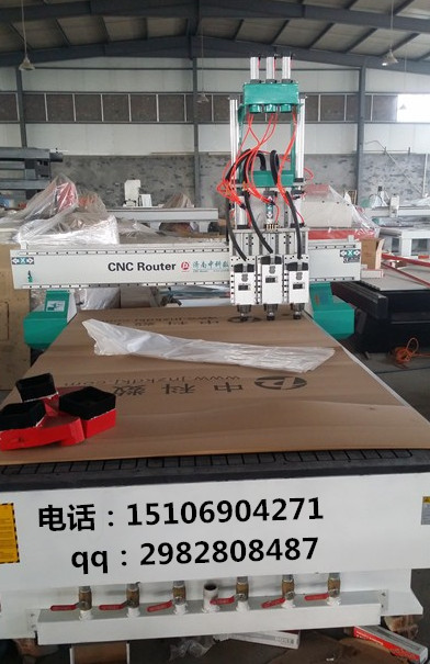中科数控气动三头雕刻机是数控机电一体化产品,采用国际标准指令,可以连接CAD/CAM系列软件,三个机头采用气泵控制可任意切换,能够轻松完成计算机设计的各种程序,三把可任意切换,适合于木门家具生产中的一次有多种花形的产品,技术水平完全等同于美国同类最新设备。速度极快,切割10MM密度板速度可达:15米/分!切割20MM密度板速度可达:8米/分!一台顶五台!