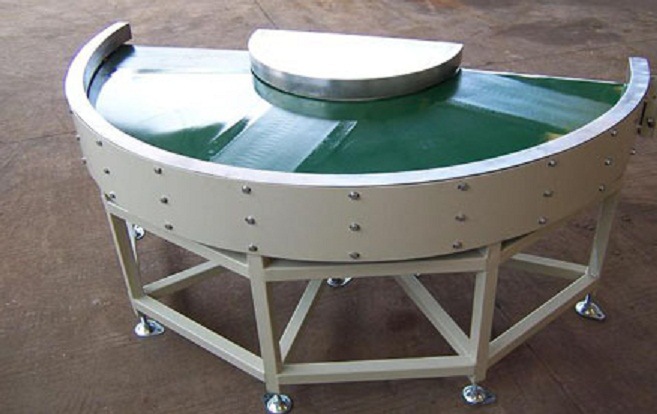 转弯皮带输送机扇形皮带加装专用的防跑偏滚轮(轴承外加聚甲醛POM)或者在输送带的外侧高频焊接导向筋使输送带运行在专用的导轨中,辊筒采用专用的锥型包胶辊筒,广泛应用在食品、饮料、电子、烟草等行业,我们可以选用较小直径的滚筒,使转角连接更加方便,完美的解决过渡问题。