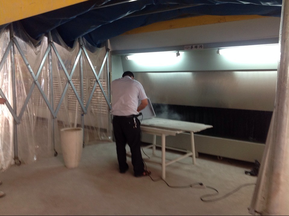通过百叶窗侧面吸风与台面下吸风的方式吸尘,通过水帘清洗与过滤材料过滤后相对干净的空气排出来.