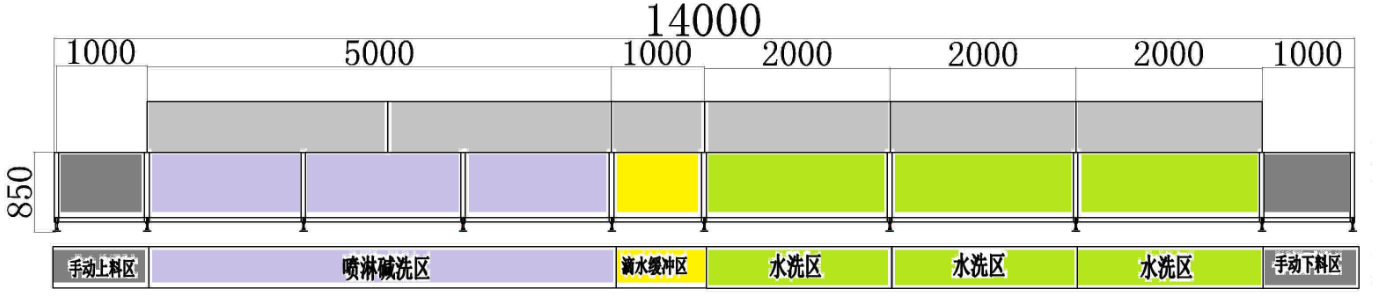 清洗线外观尺寸总长约14000mm, 链条宽约365mm内槽宽380mm工作台机架外宽约500mm,整机外宽约1000mm,清洗腔内高550mm,工作台面高850mm,总高度约1500mm。整机占地约14㎡。采用步进式输送由精密伺服电机控制