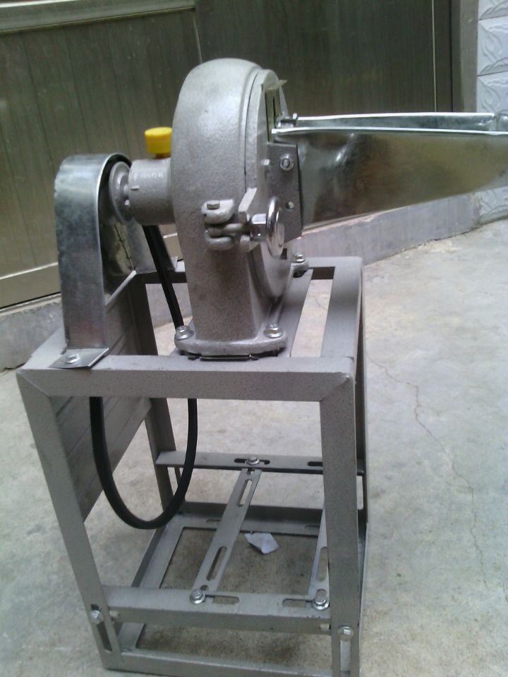 经齿圈和物料相互撞击而粉碎,被粉碎的物料在气流的帮助下, 2.2千瓦单相电机与其匹配,解决了没有动力电源的问题。该齿爪式粉碎机,在机座上装有主机,主机包括有机体以及和机体连接在一起的活门组成粉碎室,机体内装有轴承以及由轴承支承的主轴,主轴伸出机体外部的一端装有皮带轮,在粉碎室内的一端装有转子,轴承两端装有内端盖和外端盖,转子上紧固有数圈钢齿,与固定在活门里的齿盘交错配置,活门上端有入料口,入料口上面装有盛料斗,活门下端有出料口