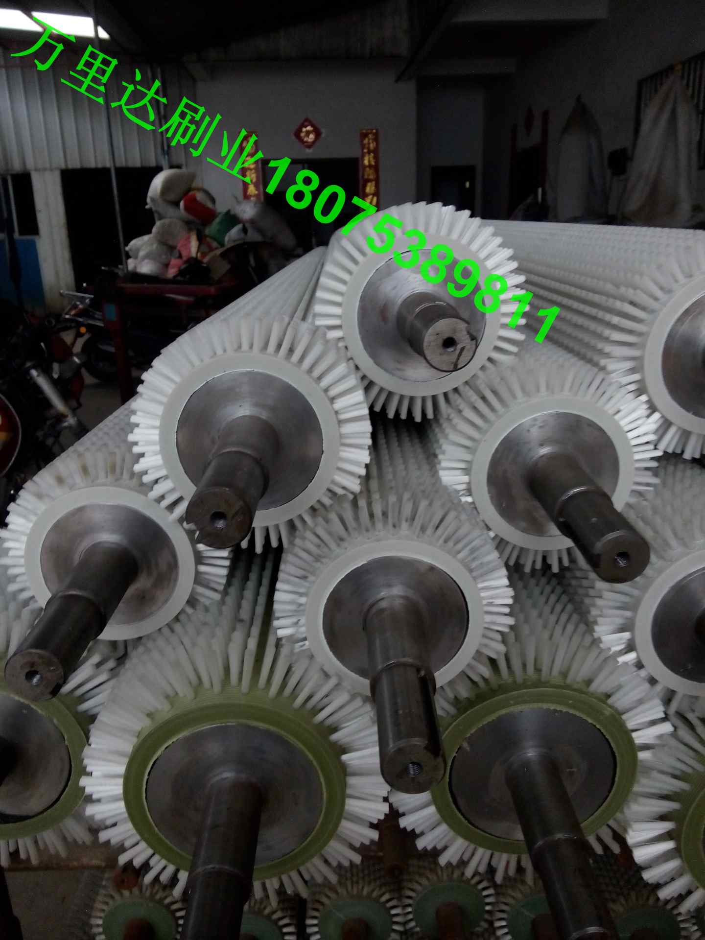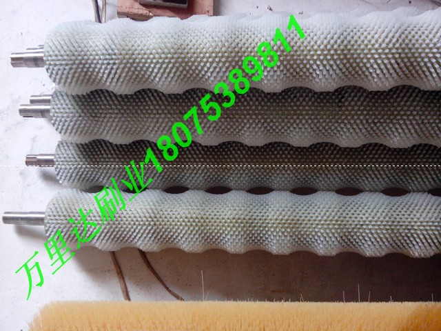 毛刷辊一般由金属轴、刷丝附着体(塑料管、尼龙管等)、刷丝组成。 加工程序包括:车轴、套管(浇注)、采眼、栽毛、平毛。八达制刷厂对特别异形毛刷辊在杌植栽毛无法完成的情况下,用手工栽植毛料。毛刷辊适用的5种行业:食品加工业,玻璃陶瓷业,金属加工业,抛光清洗业,纺织机械。 水果、蔬菜等工业化生产时,用尼龙的刷辊对各种水果、胡萝卜等农业作物进行清洗,要求刷丝抗压、弹性好,但又不能擦伤水果和蔬菜。食品机械毛刷材料采用PA6、PA66、611,612,、010丝等,辊芯使用45#圆钢或不锈钢件,注塑,植入耐高温尼龙刷丝,用于清洗水果表面污垢和表面打蜡;刷毛多选用防菌尼龙1010,耐温耐磨,刷丝不回弯,不掉毛。新型设计两片组合式毛刷辊,用304不锈钢做通轴,可以只换刷毛不用全套更换,大大降低了成本