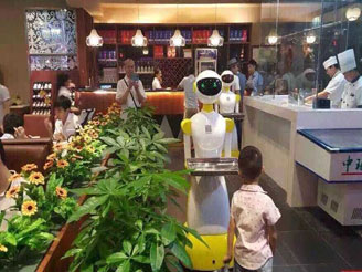 餐厅地面预先设置好引环形引导线,在传菜口工作人员把做好的菜放在机器人托盘上,并设置目标餐桌。机器人自动根据预设的地图,一路运行到目标餐桌,并提醒顾客取餐。机器人自带避障装置,当机器人送菜过程中,引导线前方有障碍物,例如有个孩子在机器人前方。机器人自动停止,并语音提醒前方人员让开。当前方障碍人员让开以后,机器人继续送菜。