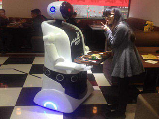 餐厅地面预先设置好引环形引导线,在传菜口工作人员把做好的菜放在机器人托盘上,并设置目标餐桌。机器人自动根据预设的地图,一路运行到目标餐桌,并提醒顾客取餐。机器人自带避障装置,当机器人送菜过程中,引导线前方有障碍物,例如有个孩子在机器人前方。机器人自动停止,并语音提醒前方人员让开。当前方障碍人员让开以后,机器人继续送菜。