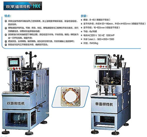 华源电机设备自主研发的电机定子绑线机是一款全自动的绑线机。华源所研发的自动绑线机包括单面定子绑线机和双面定子绑线机,该设备主要为固定定子绕线组,让绕线组更加扎实,防止绕组的绕线掉落,增加定子的安全系数和使用寿命。该设备依靠精密的机械传动、伺服和拨动控制,采用先进的电气控制系统及智能化的操作界面,具有自动送线、钩线、分度,每槽绑、隔槽绑等功能。根据需要设定槽数,更换工装来实现不同规格定子的生产,从而满足客户的不同需要.操作极为方便,生产质量稳定,效率高,是电机生产厂商的理想生产设备。