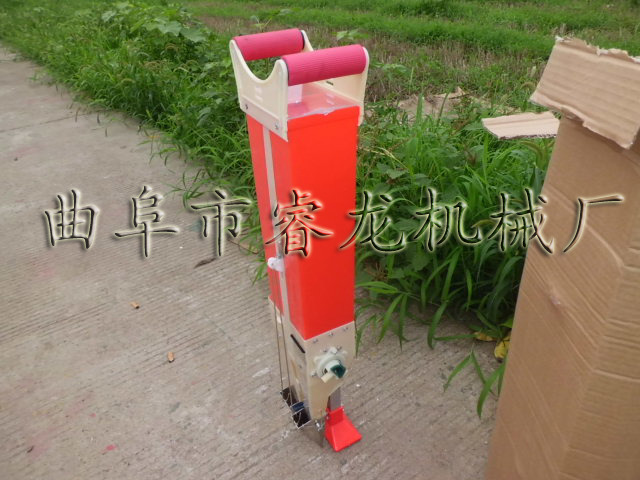 (2)双手握住手柄,对准垄上标尺点出的印迹,快速插入土中,缓势拔出,往扎完的埯上踩一脚或扎完后镇压一遍效果既快又好。